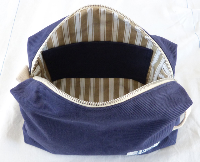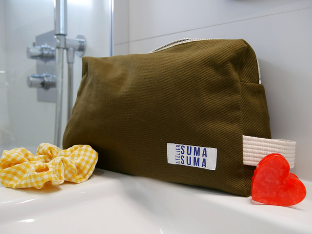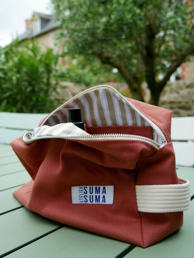 Trousse de toilette cousue à la main dans mon atelier, en tissus 100 % coton, tissés et teints en France.